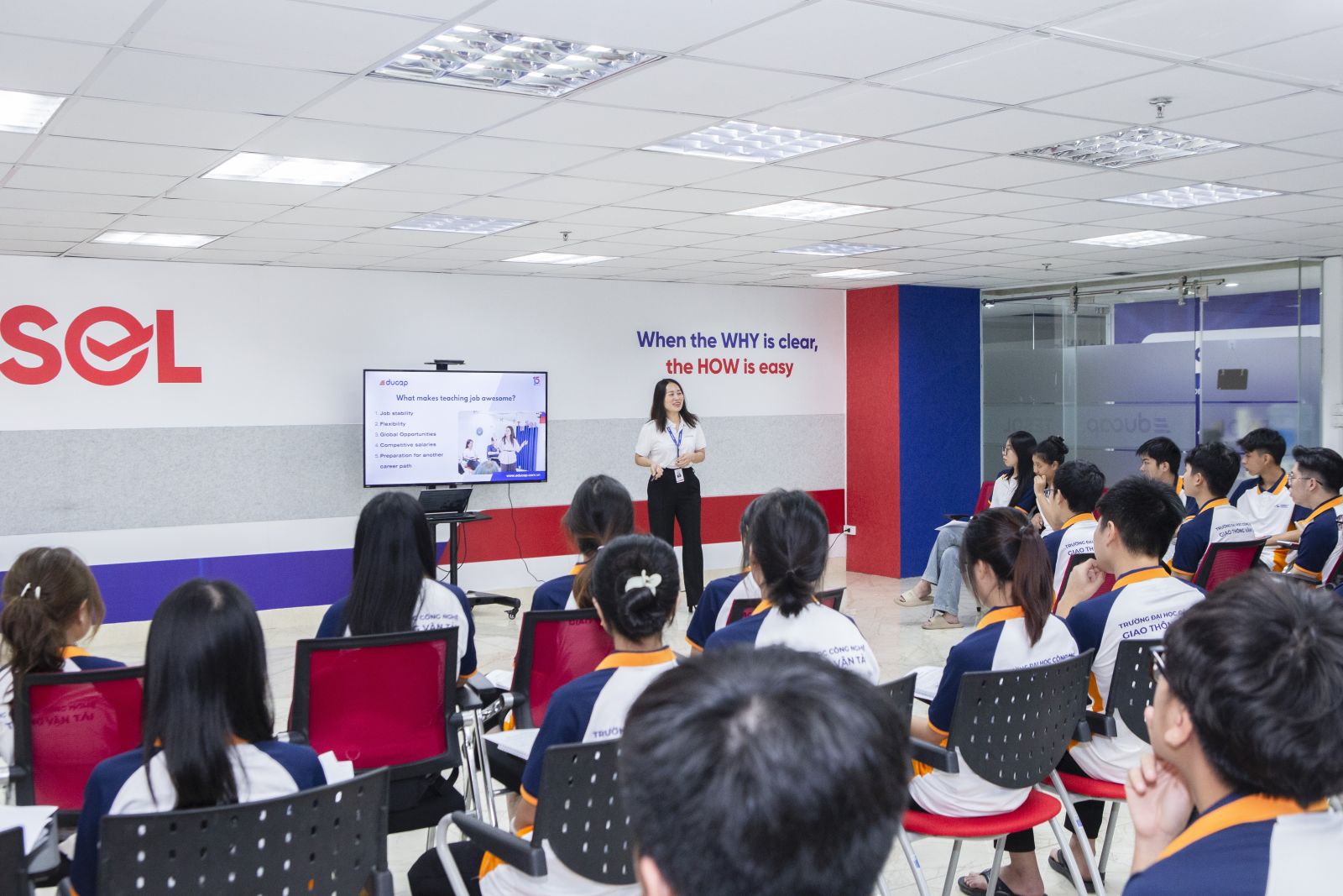 Trong chuyến đi này, sinh viên được lắng nghe những chia sẻ quý báu của các chuyên gia Educap về những kinh nghiệm thực tế, lộ trình để trở thành giáo viên tiếng Anh chuyên nghiệp và định hướng cho sinh viên những bước đi cần thiết để phát triển của bản thân trong tương lai. Bên cạnh đó, các em sinh viên và các chuyên gia cũng đã có thảo luận, trao đổi và giải đáp thắc mắc liên quan đến các lĩnh vực cơ hội làm việc tại công ty sau khi ra trường.