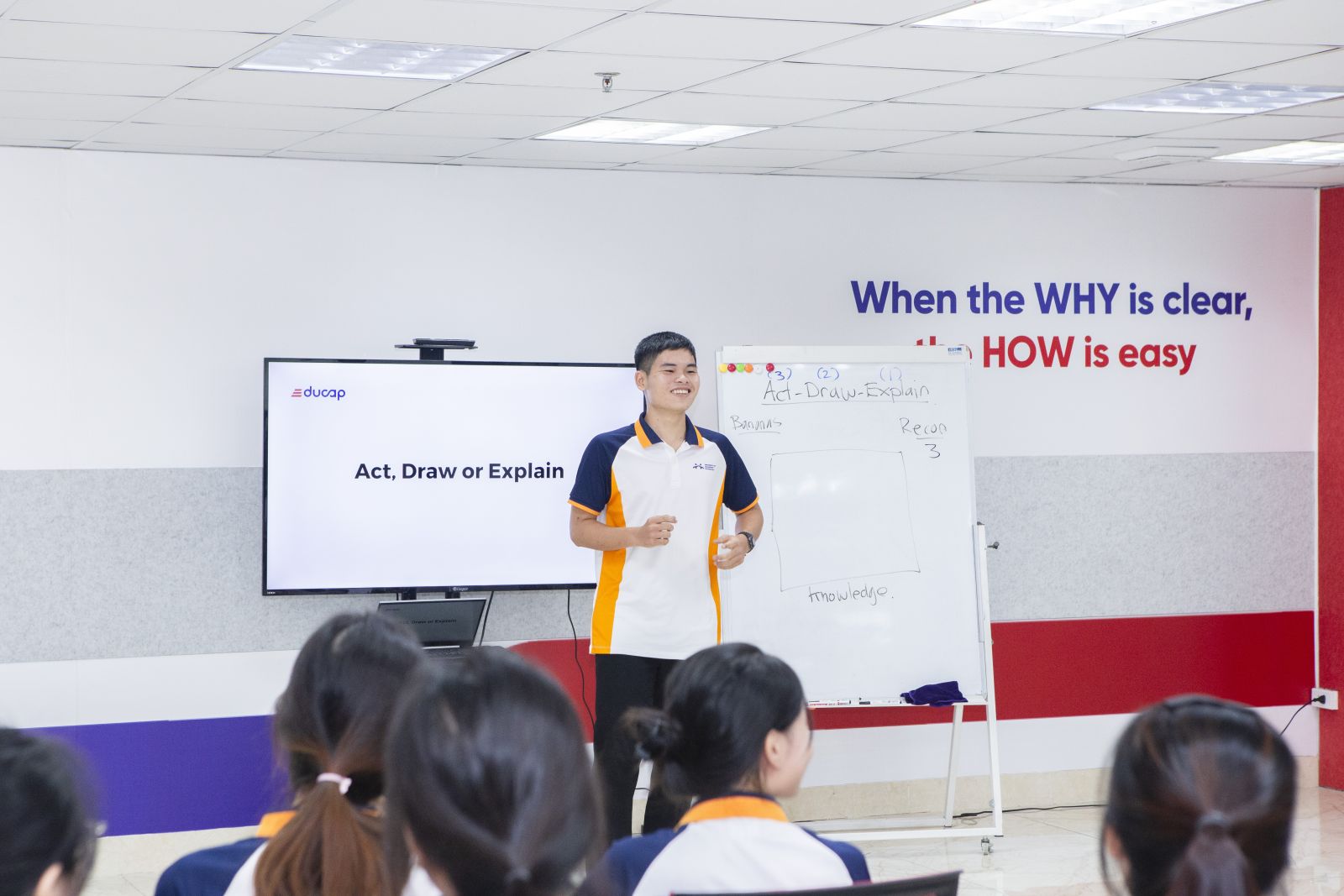 Ngoài ra, các em còn được tham gia vào các hoạt động giảng dạy tiếng Anh cùng đội ngũ giáo viên tại Educap. Những trải nghiệm thực tế về giảng dạy và phát triển ngôn ngữ, cùng với những bài học bổ ích từ chuyên gia về các kỹ năng giao tiếp, thuyết trình, quản lý lớp học và cách thức áp dụng công nghệ vào giảng dạy đã trang bị cho các em những kỹ năng quan trọng.