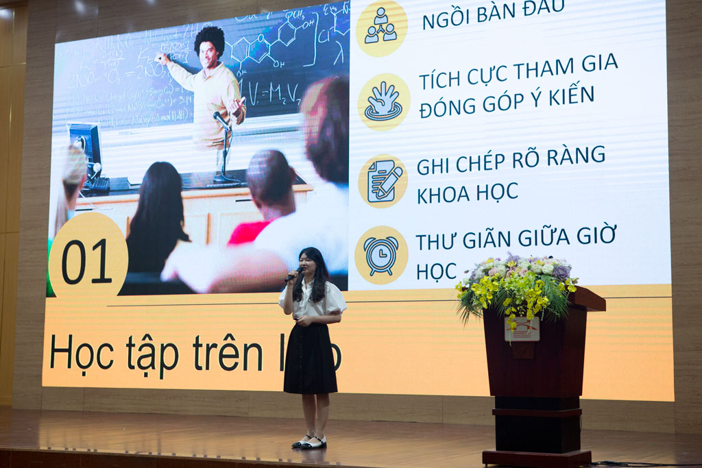 Mời đến chia sẻ về phương pháp học tập hiệu quả trong buổi tọa đàm là sinh viên Tống Thị Linh Chi – lớp 73DCKT22 chuyên ngành kế toán doanh nghiệp, cô gái vô cùng xinh đẹp và tài năng với các thành tích đầy ấn tượng. Theo bạn Linh Chi, để giúp chúng ta tập trung chú ý và dễ dàng tiếp nhận những kiến thức mà các thầy, cô giáo giảng ngay từ trên lớp học cần thực hiện một số giải pháp như: ngồi bàn đầu, tích cực tham gia đóng góp ý kiến, ghi chép rõ ràng và khoa học, thư giãn giữa giờ học; về nhà phải chăm chỉ đọc lại bài, xem thêm tài liệu...