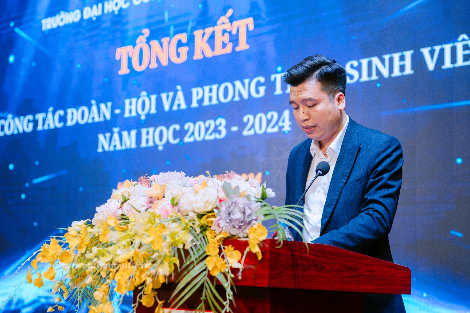 Đồng chí Phùng Công Dũng – Phó Bí thư Đoàn thanh niên, Chủ tịch Hội Sinh viên Trường báo cáo tổng kết những thành tích đạt được trong công tác Đoàn – Hội suốt năm học 2023-2024