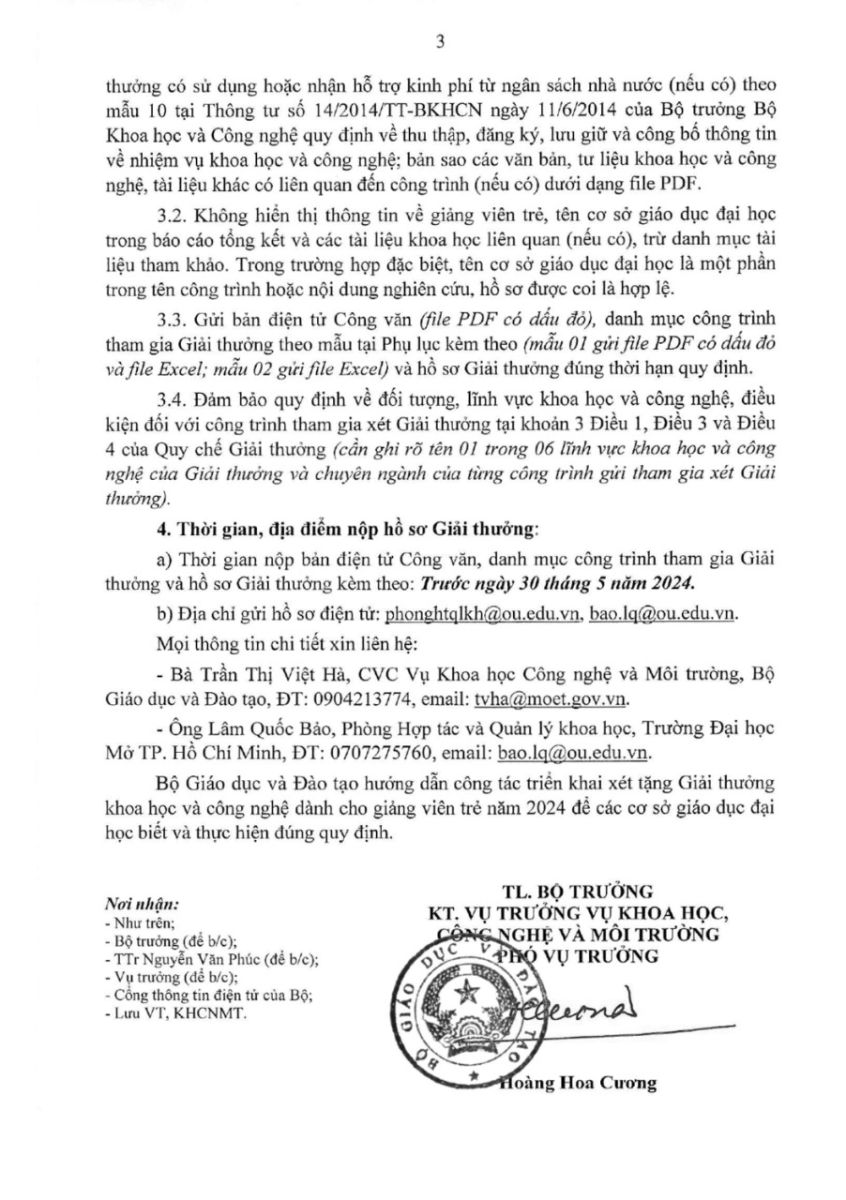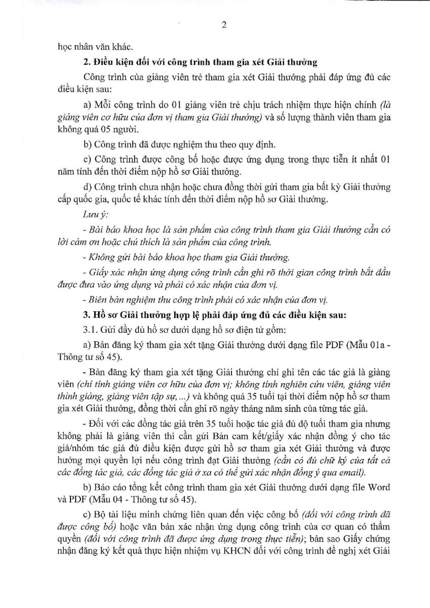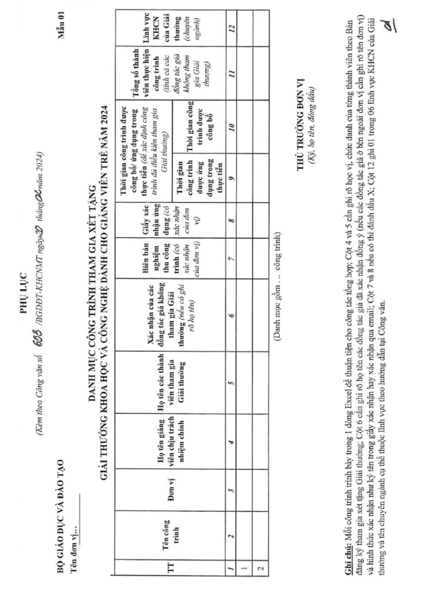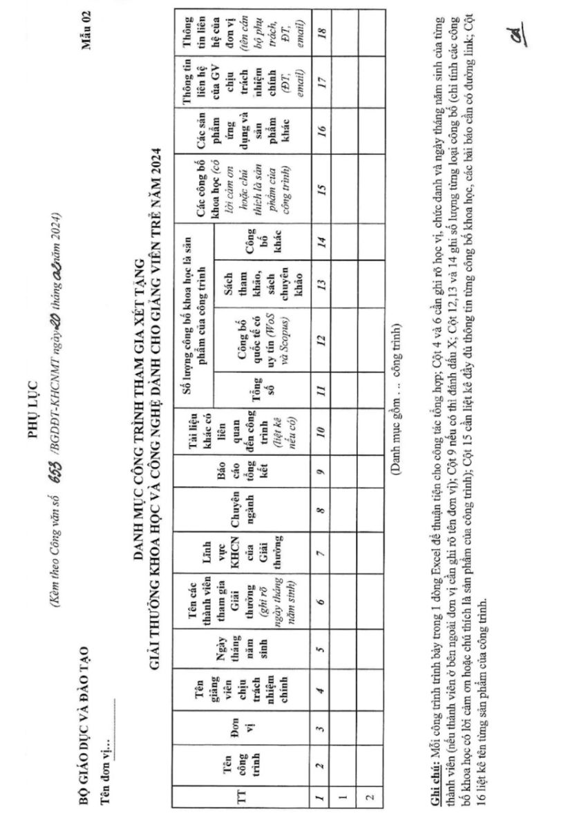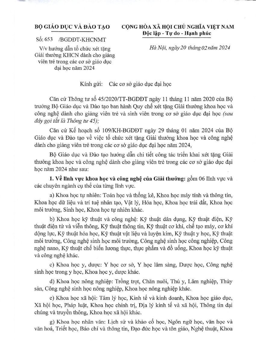 Hướng dẫn tổ chức xét tặng Giải thưởng KHCN dành cho giảng viên trẻ trong các cơ sở giáo dục đại học năm 2024 22/02/2024 15:02 File đính kèm 653-BGDDT-KHCNMT-152.pdf