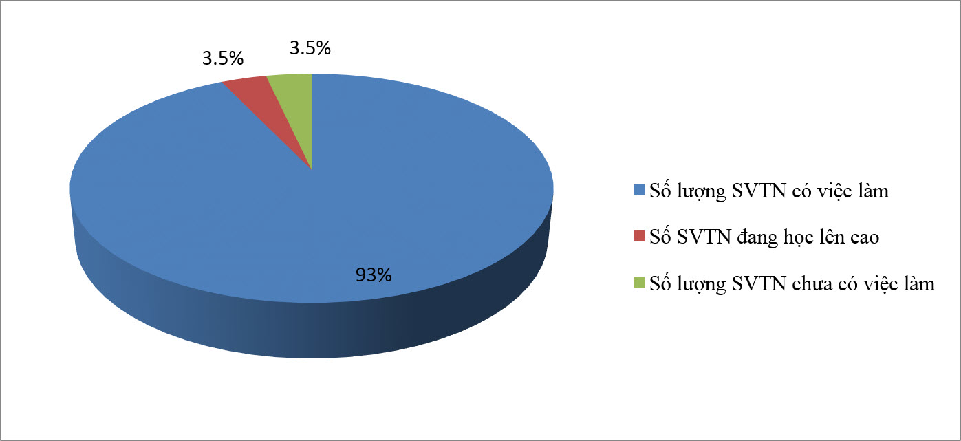 Trong Bảng số liệu trên có 93% có thông tin phản hồi đã có việc làm; 3.5% SVTN tiếp tục đi học nâng cao trình độ rồi mới có ý định tìm việc làm; 3.5% sinh viên TN chưa có việc làm. Như vậy tỷ lệ SVTN có việc làm là: (209+8)/225 = 96.5%