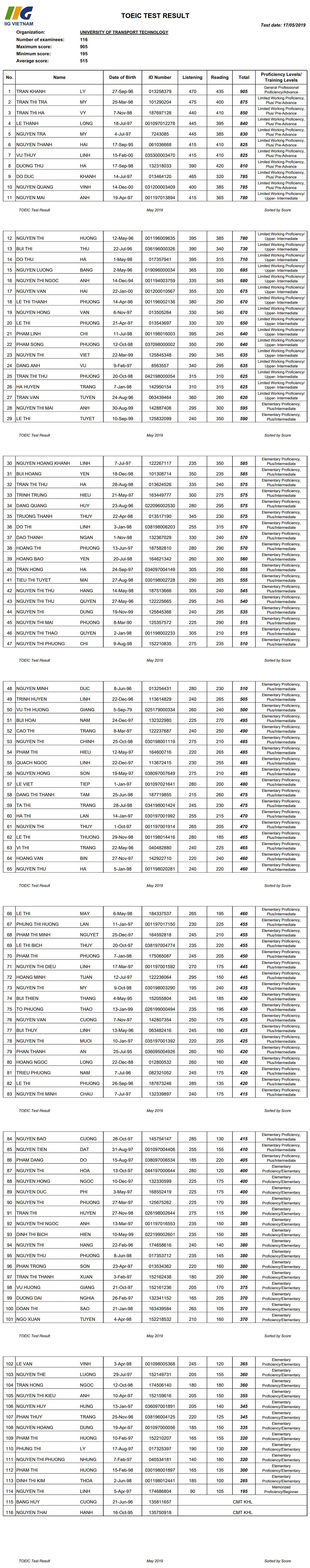 Kết quả TOEIC ngày 17.5.2019 tại Trường Đại học Công nghệ GTVT