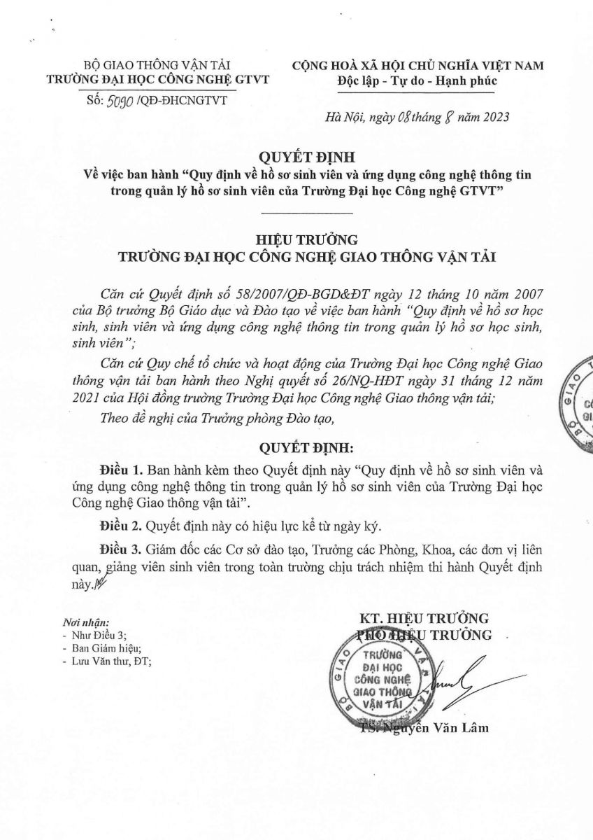 Quy định về hồ sơ sinh viên và ứng dụng CNTT trong quản lý hồ sơ sinh viên của Trường Đại học Công nghệ GTVT 08/08/2023 16:08 File đính kèm 16.8-QD-QLHSSV-2023.pdf