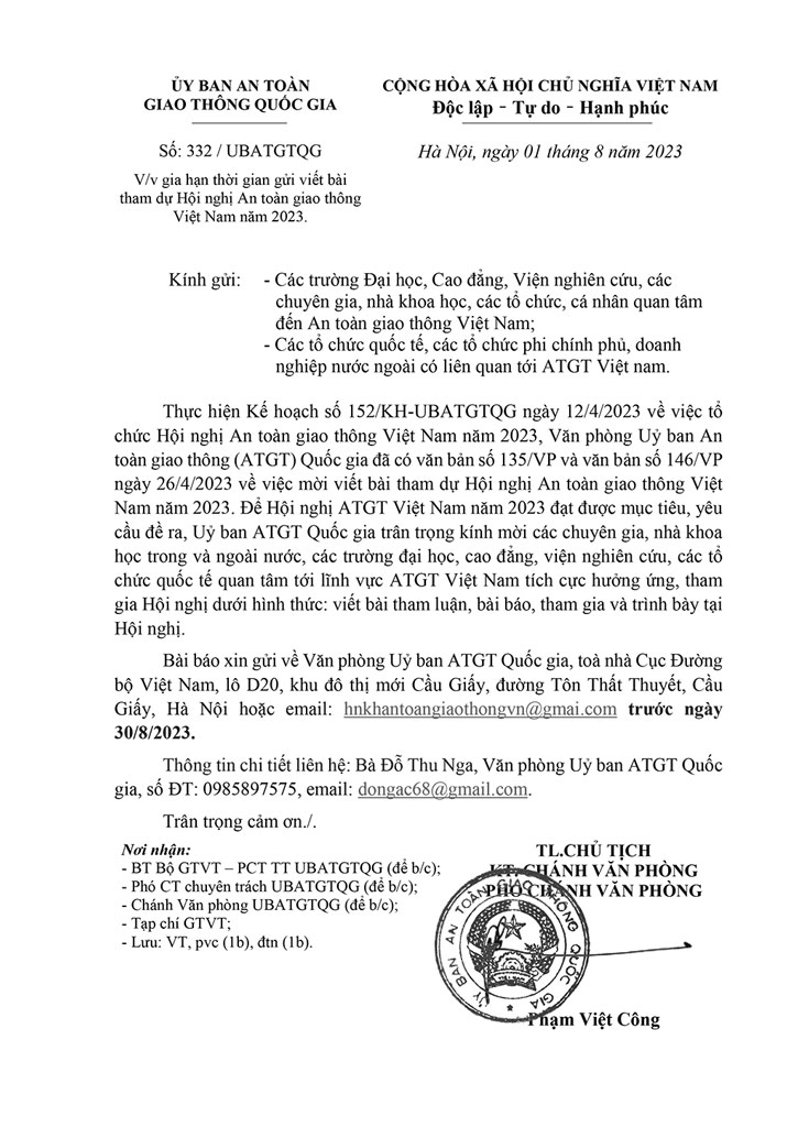 Thông báo gia hạn thời gian gửi viết bài tham dự Hội nghị An toàn giao thông Việt Nam năm 2023 02/08/2023 10:08