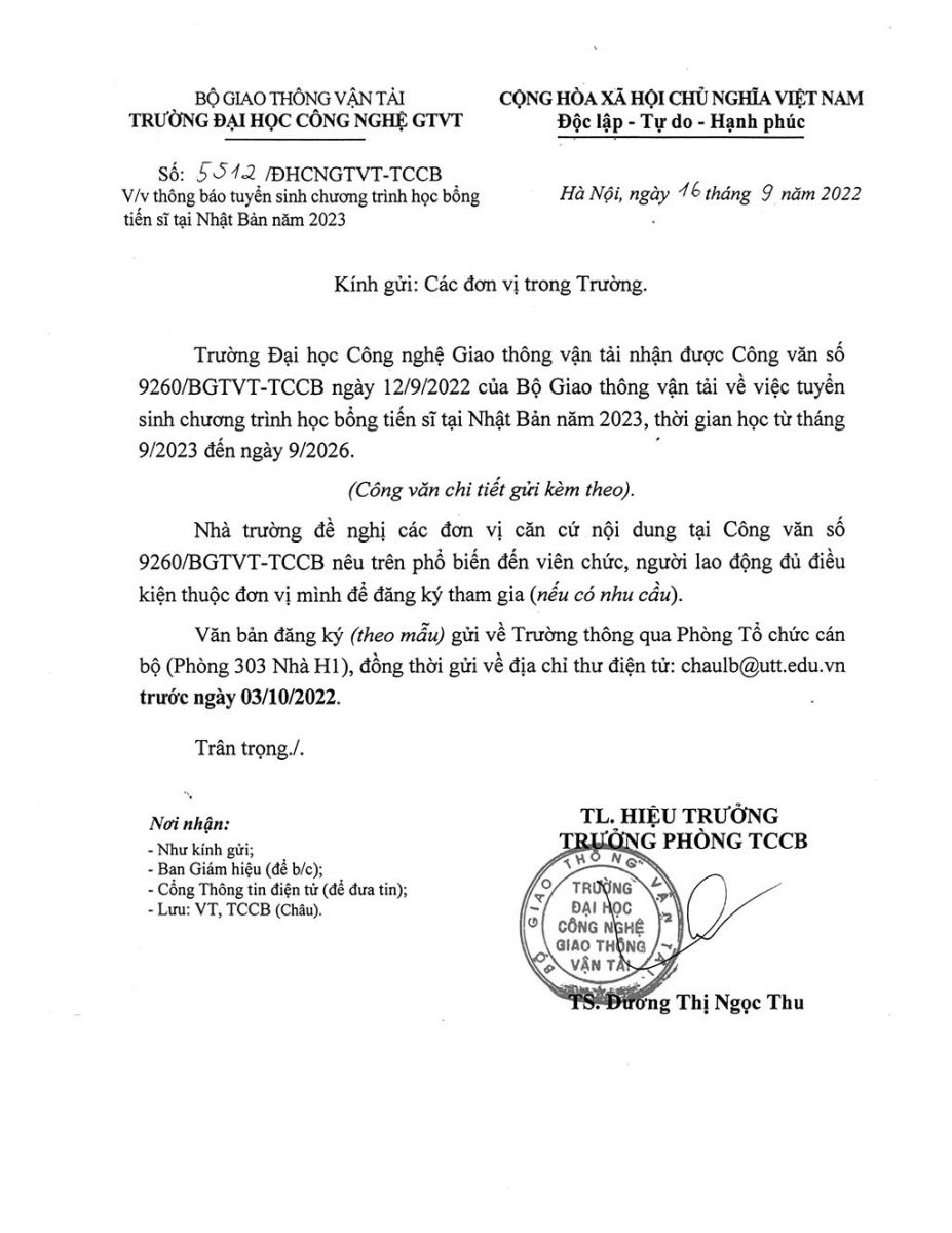Thông báo tuyển sinh chương trình học bổng tiến sĩ tại Nhật Bản năm 2023 16/09/2022 10:09 File đính kèm 9260-BGTVBT-TCCB-1026.pdf