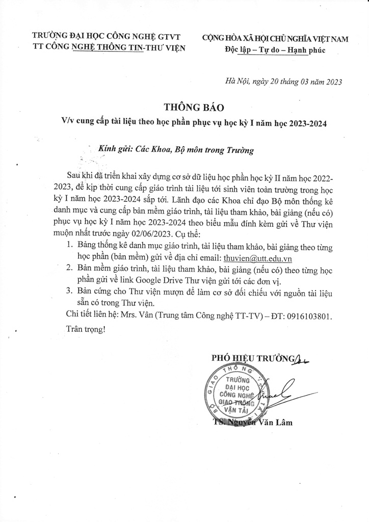 Thông báo về việc cung cấp tài liệu theo học phần phục vụ học kỳ 1 năm học 2023-2024 28/03/2023 14:03