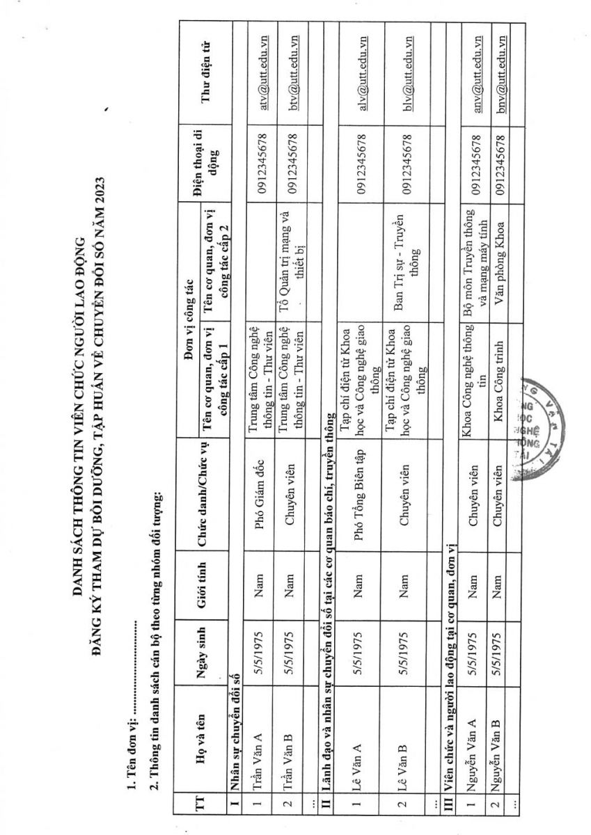 Thông báo về việc đăng ký tham gia bồi dưỡng, tập huấn chuyển đổi số năm 2023 03/08/2023 11:08 File đính kèm 20230802_4930-Bieu-mau-dang-ky-tap-huan-cds.xlsx 20230801_69104-1690882056-493-TTCNTT-TH_931.pdf Tin liên quan Thông báo về việc nộp giấy ủy quyền quyết toán thuế thu nhập cá nhân năm 2025 05/12/2025 Thông báo Tuyển sinh chương trình học bổng toàn phần tại Trường ĐH Quốc gia Hàn Quốc (KNUT) năm học 2025 - 2026 04/12/2025 Thông báo về việc ngừng, giảm mức cung cấp điện 02/12/2025 Thông báo về việc quy định tạm thời các vị trí đỗ xe ô tô tại Phân hiệu Hà Nội 30/11/2025 Thông báo về việc tổ chức khóa học tiếng anh giao tiếp cho viên chức, người lao động 28/11/2025 Thông báo về việc tham gia khóa học tiếng Anh 21/11/2025