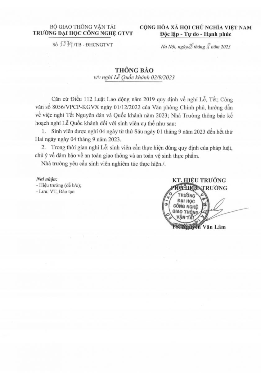Thông báo về việc nghỉ Lễ Quốc khánh 02/9/2023