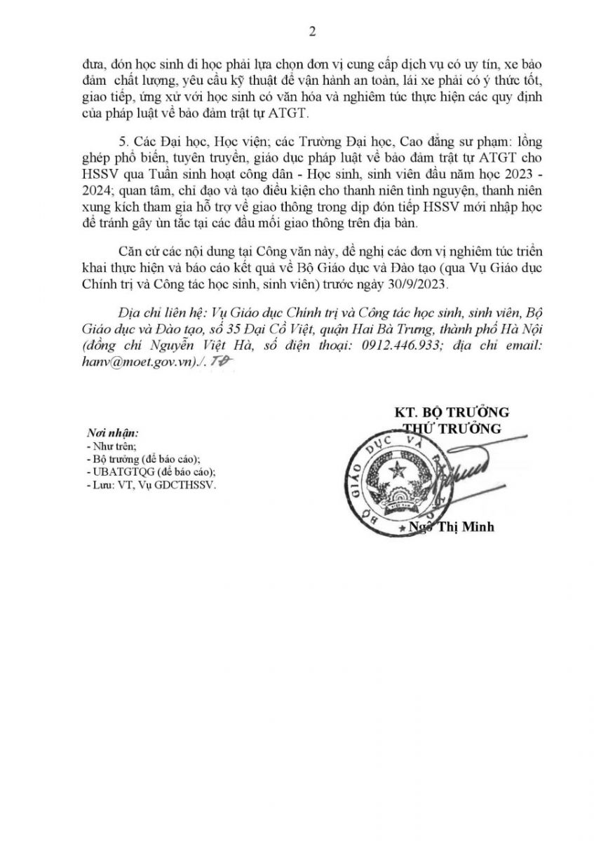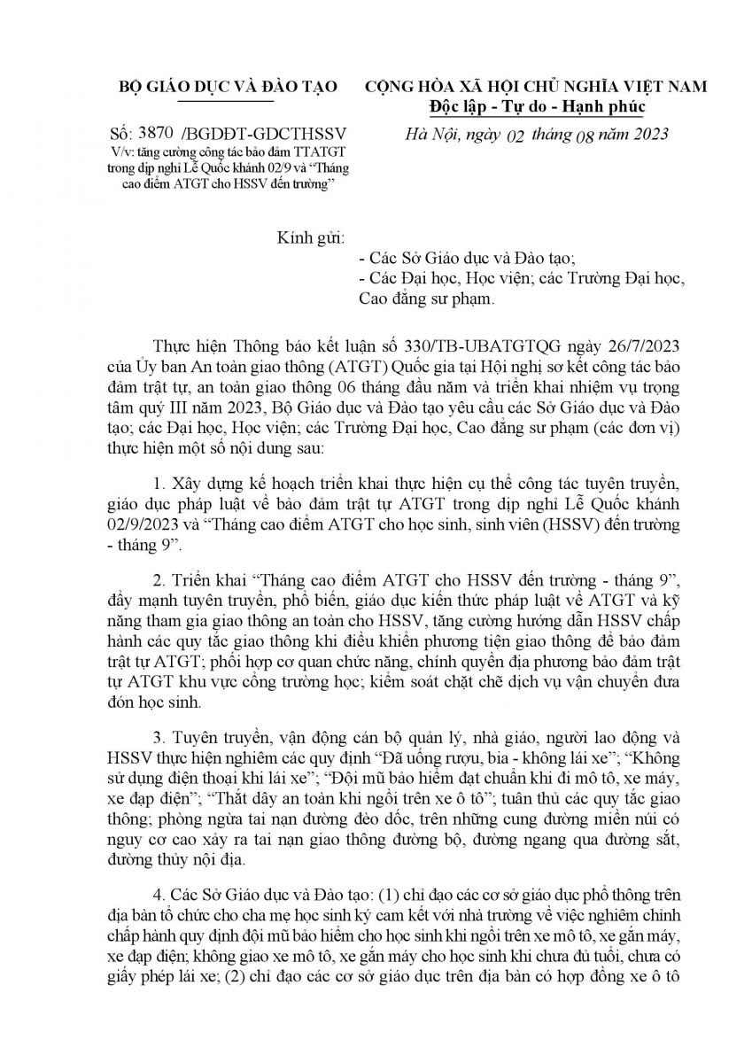Thông báo về việc tăng cường công tác đảm bảo TTATGT trong dịp Lễ Quốc Khánh 02/9 và Tháng cao điểm ATGT cho HSSV đến trường 04/08/2023 12:08