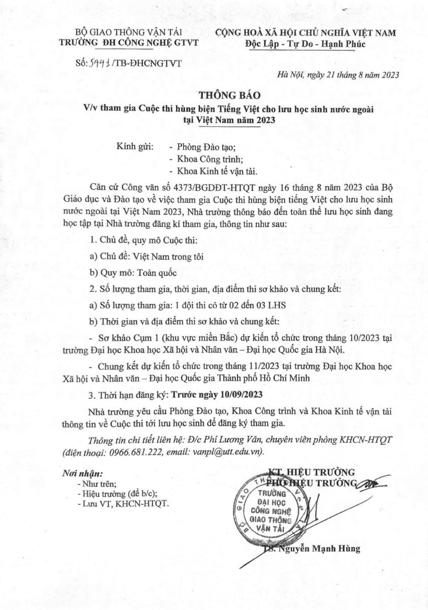 Thông báo về việc tham gia Cuộc thi hùng biện Tiếng Việt cho lưu học sinh nước ngoài tại Việt Nam năm 2023 30/08/2023 09:08