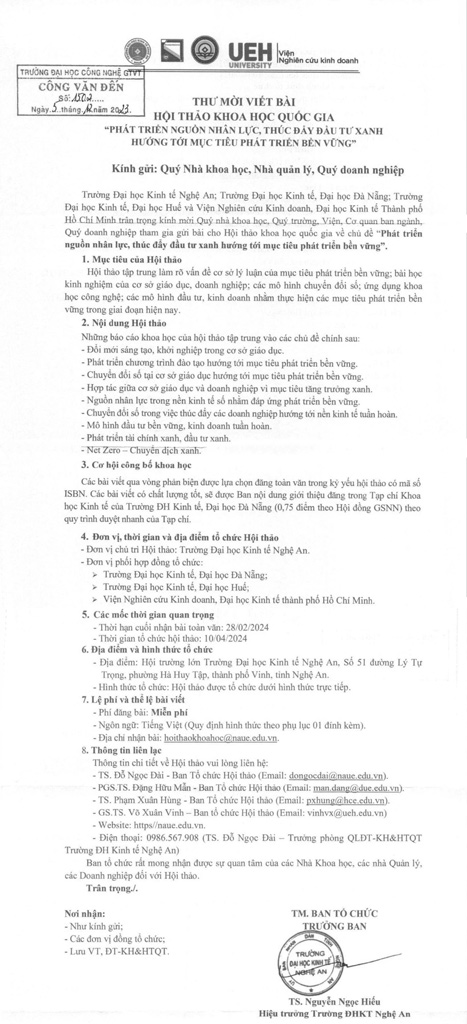 Thư mời viết bài Hội thảo khoa học quốc gia "Phát triển nguồn nhân lực, thúc đẩy đầu tư xanh hướng tới mục tiêu phát triển bền vững" 06/12/2023 10:12
