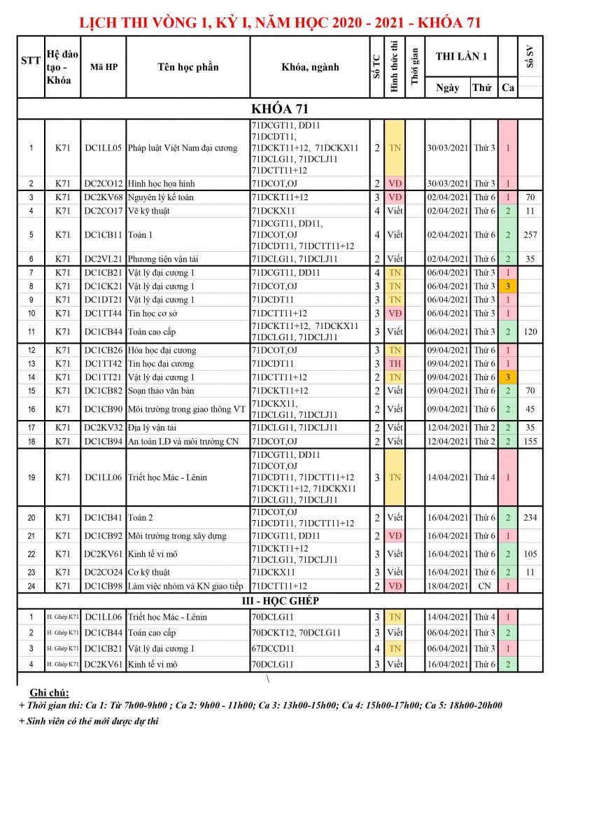 LỊCH THI KHÓA 71: THI VÒNG 1, KỲ 1_20_21