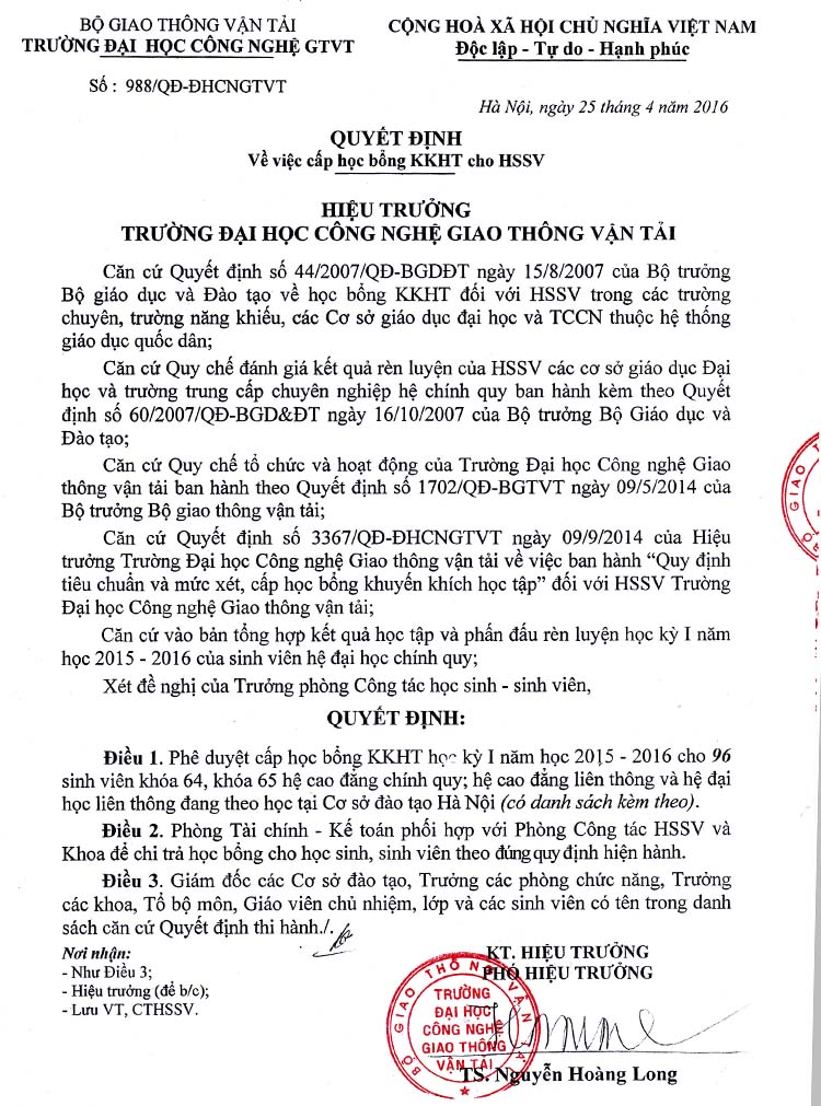 Thông báo Quyết định cấp học bổng KKHT học kỳ I năm học 2015 - 2016