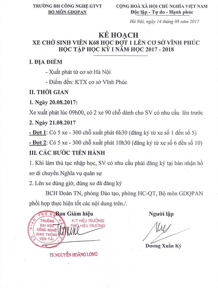 Kế hoạch đưa sinh viên K68 lên học tập tại Vĩnh Phúc