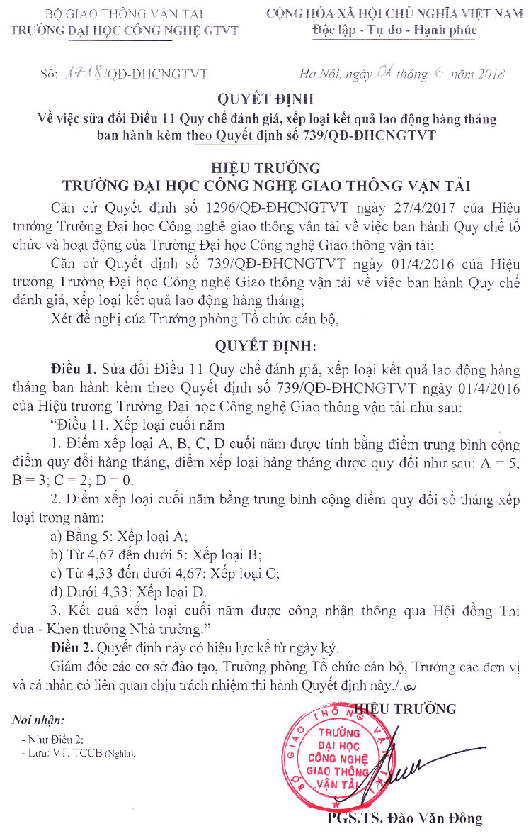 Quyết định sửa đổi Điều 11 Quy chế đánh giá, xếp loại kết quả lao động hàng tháng ban hành kèm theo QĐ số 739/QĐ-ĐHCNGTVT
