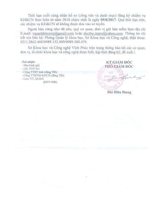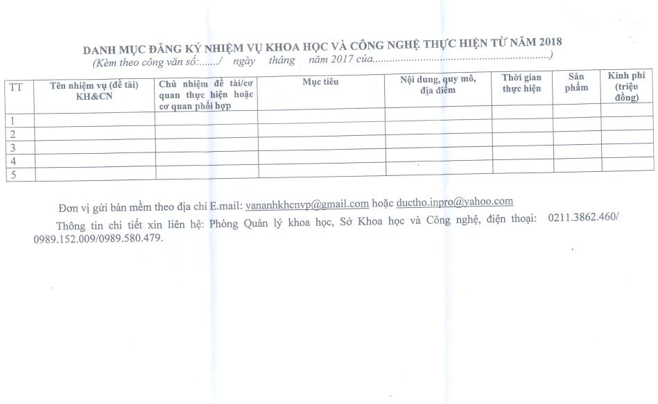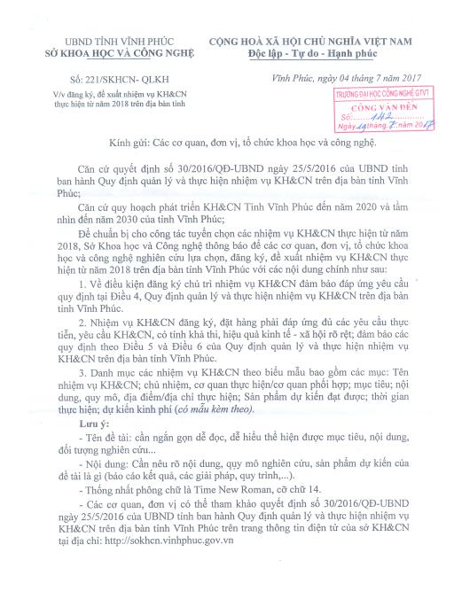 Thông báo Kế hoạch đăng ký nhiệm vụ KH&CN thực hiện từ năm 2018