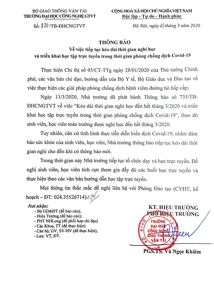 Thông báo kéo dài thời gian nghỉ học và triển khai học tập trực tuyến
