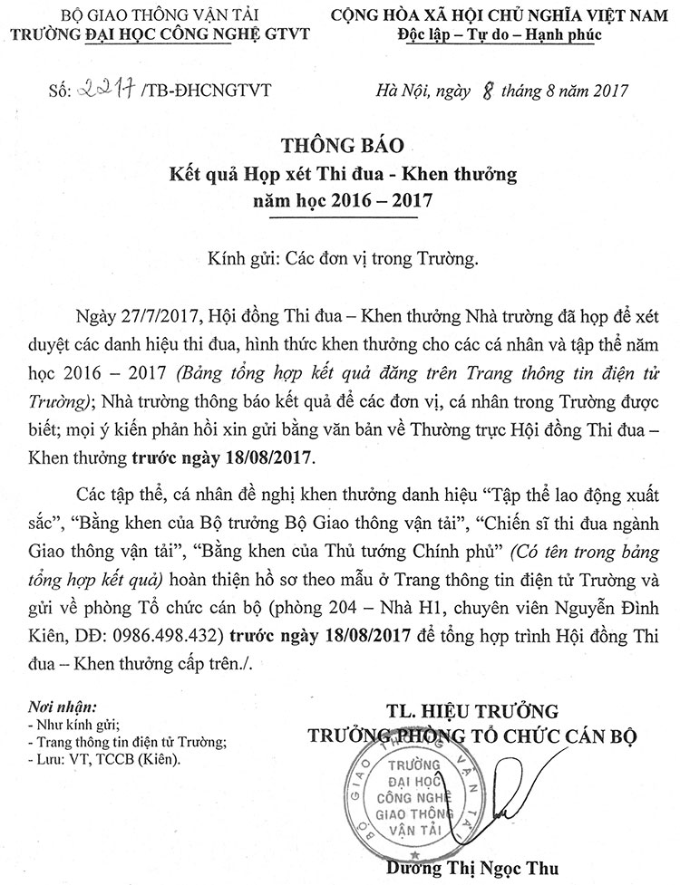 Thông báo Kết quả Họp xét Thi đua - Khen thưởng năm học 2016 - 2017