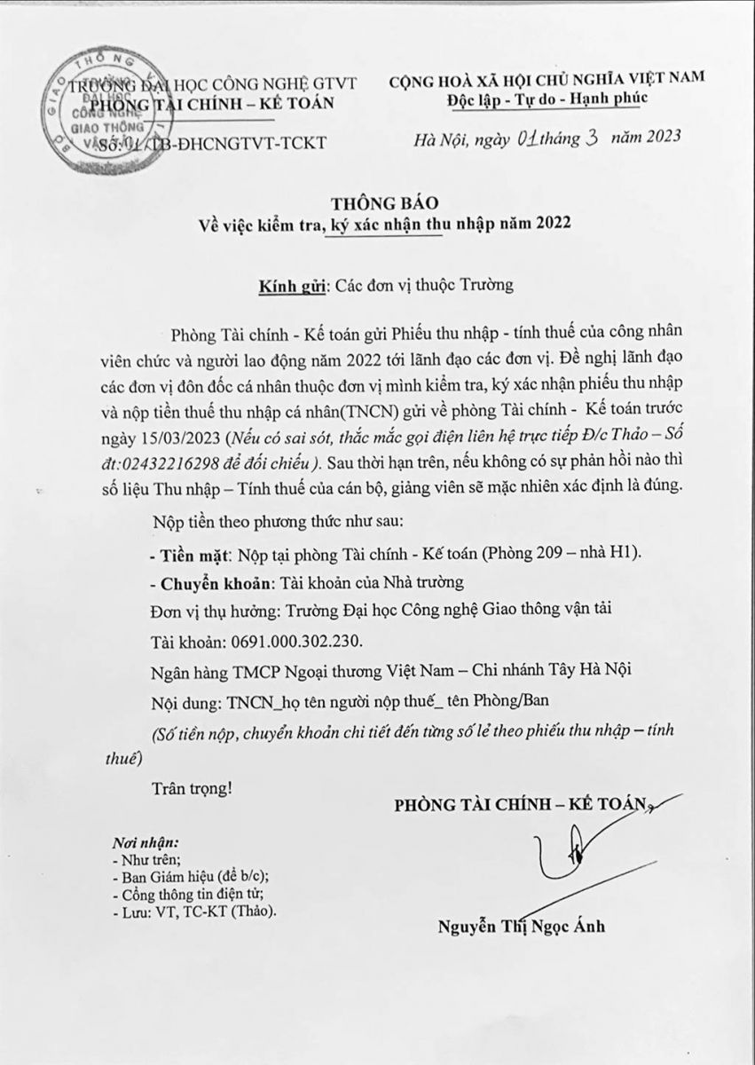 Thông báo kiểm tra, ký xác nhận thu nhập năm 2022