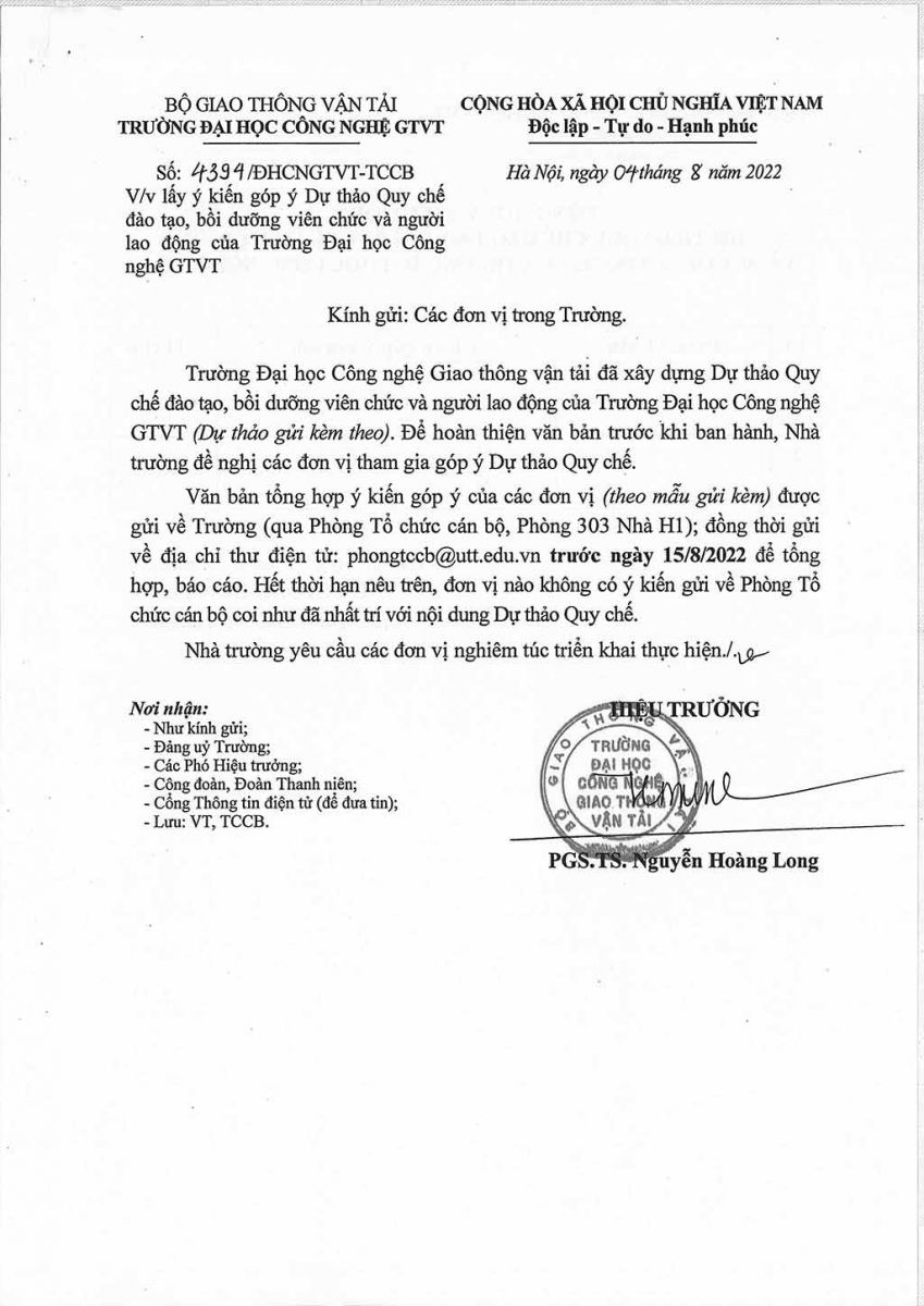 Thông báo lấy ý kiến góp ý Dự thảo Quy chế đào tạo, bồi dưỡng viên chức và NLĐ Trường ĐH Công nghệ GTVT