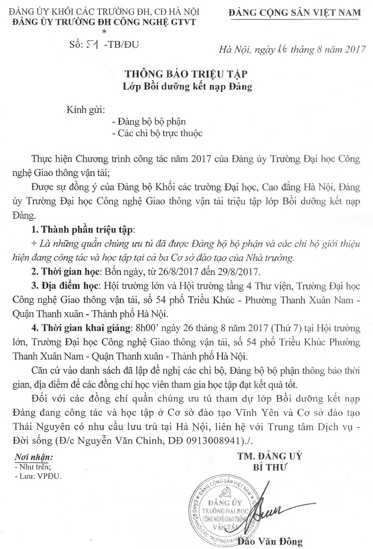 Thông báo triệu tập lớp Bồi dưỡng kết nạp Đảng năm 2017