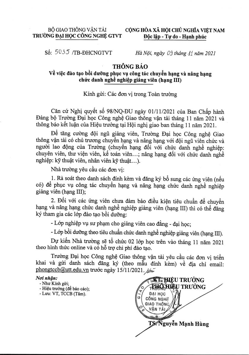 Thông báo về việc đào tạo bồi dưỡng phục vụ công tác chuyển hạng và nâng hạng chức danh nghề nghiệp giảng viên (hạng III)