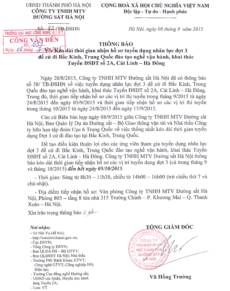 Thông báo Kéo dài thời gian nhận hồ sơ tuyển dụng nhân lực đợt 3, tuyến ĐSĐT số 2A, Cát Linh - Hà Đông