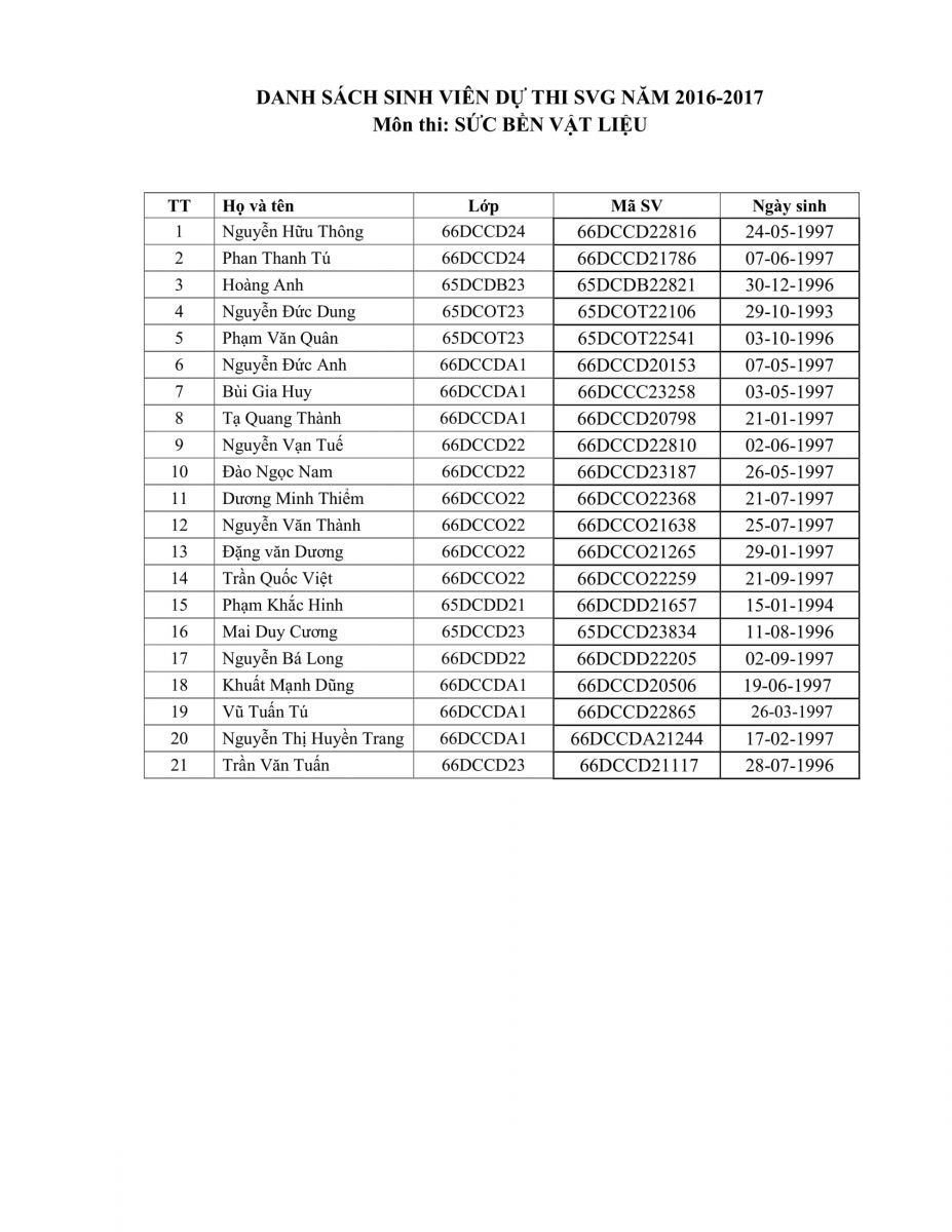 DANH SÁCH SINH VIÊN DỰ THI SVG NĂM 2016-2017 MÔN SỨC BỀN VẬT LIỆU