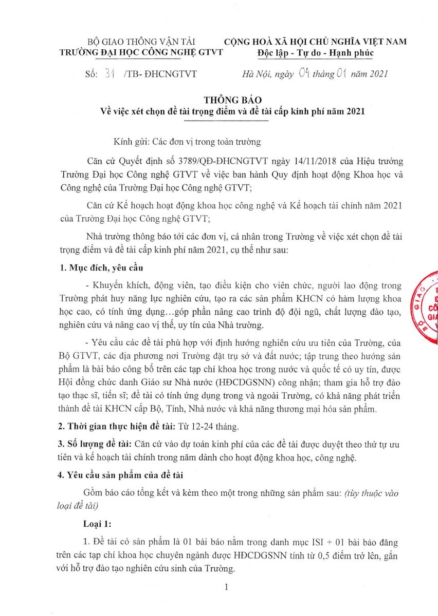 Thông báo về việc xét chọn đề tài trọng điểm và đề tài cấp kinh phí năm 2021