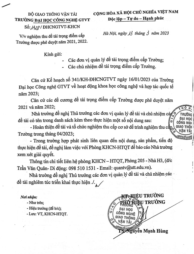 Thông báo về việc nghiệm thu đề tài trọng điểm cấp Trường được phê duyệt năm 2021-2022