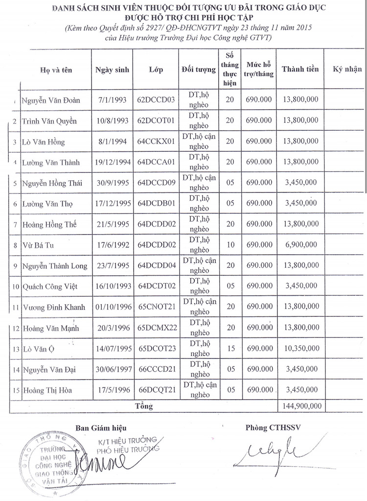 Phòng Tài chính kế toán thông báo tới sinh viên danh sách sinh viên thuộc đối tượng hộ nghèo, hộ cận nghèo được hỗ trợ chi phí học tập.