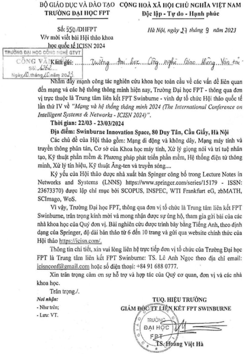 Thư mời viết bài Hội thảo Khoa học quốc tế ICISN 2024