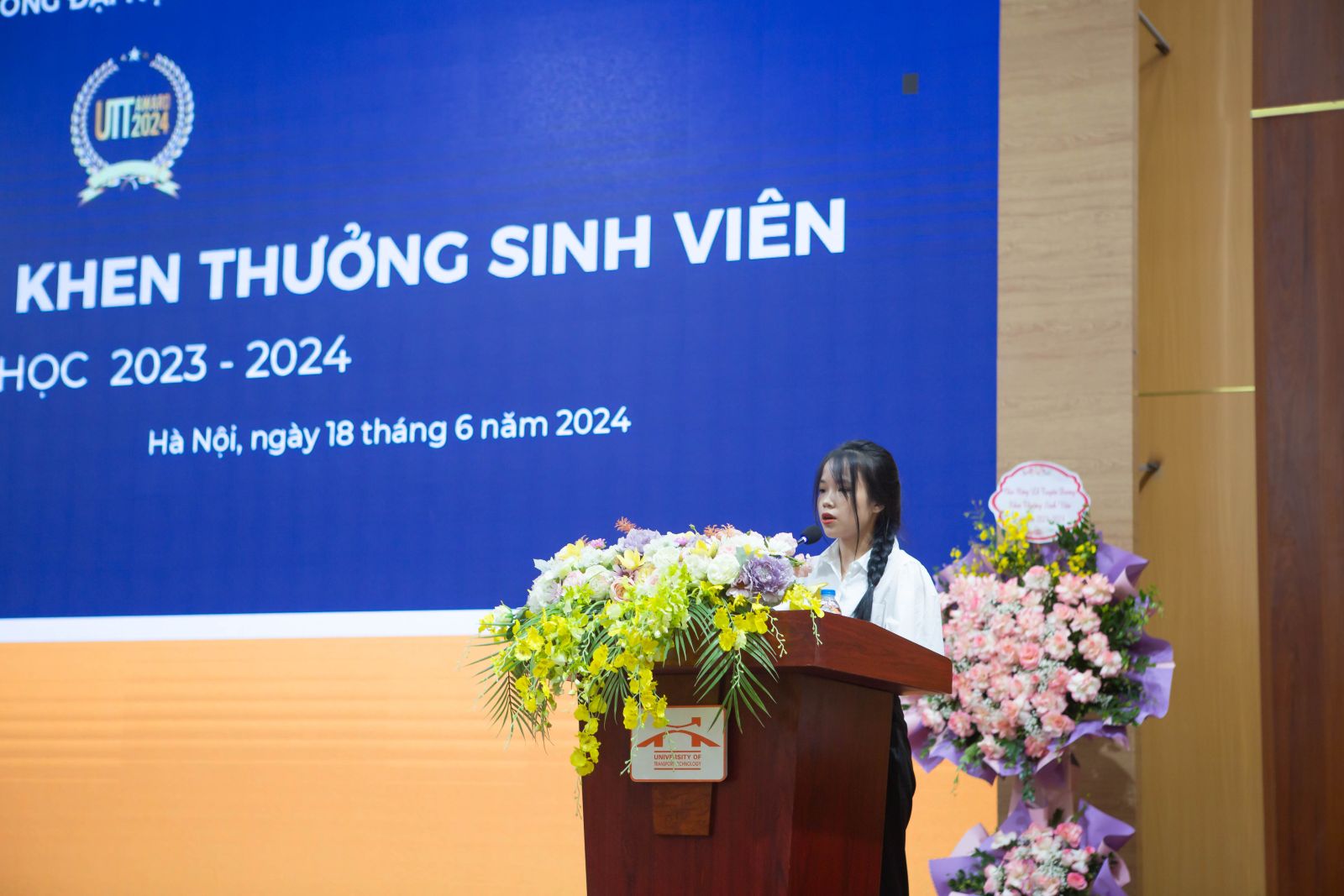 Đại diện cho các em sinh viên được tuyên dương và khen thưởng tại buổi Lễ, em Phan Thị Ngọc Ánh, sinh viên Lớp 71DCQT21, Khoa Kinh tế vận tải xứng đáng là tấm gương sáng cho các thế hệ sinh viên UTT noi theo khi em đồng thời tốt nghiệp loại Xuất sắc và loại Giỏi hai ngành học Quản trị kinh doanh và Kế toán tại Trường. Em đã gửi lời tri ân đến Ban giám hiệu Nhà trường, tập thể các thầy, cô giáo, những người đã góp phần xây dựng nên một môi trường học tập năng động, sáng tạo, tạo điều kiện để các em được tiếp nhận những kiến thức, kỹ năng cần thiết và được đứng trên bục nhận thưởng ngày hôm nay. Gửi lời nhắn nhủ đến các bạn sinh viên, em khẳng định rằng tất cả chúng ta đều xứng đáng có mặt tại đây ngày hôm nay, cùng được vinh danh vì những nỗ lực, sự chăm chỉ, cần cù trong suốt thời gian qua, chúng ta hãy tiếp tục viết tiếp ước mơ của mình, hãy cố gắng không ngừng nghỉ để xứng đáng là sinh viên UTT.