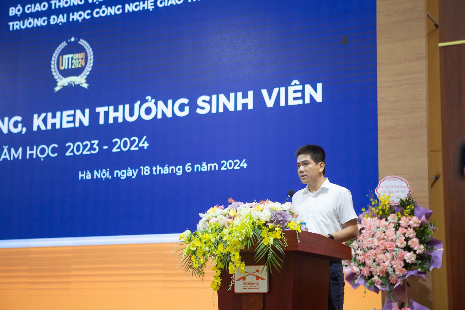 Phát biểu tại buổi Lễ, PGS.TS. Nguyễn Hoàng Long - Hiệu trưởng Nhà trường nhấn mạnh, trong năm học 2023-2024 đã đánh dấu bước ngoặt quan trọng trong công tác dạy và học của Nhà trường. Đây không chỉ là kết quả sự cố gắng của đội ngũ giảng viên, sinh viên, cán bộ UTT mà còn là sự quan tâm hỗ trợ của doanh nghiệp, sự tạo điều kiện của gia đình, người thân các em. Hy vọng rằng trong thời gian tới, các quý doanh nghiệp sẽ tiếp tục đồng hành cùng Nhà trường trong công tác đào tạo và lựa chọn ra những nhân sự chất lượng cao về công tác tại đơn vị mình; các quý phụ huynh hãy luôn là chỗ dựa vững chắc, luôn sát sao để chỉ bảo, động viên con em phấn đấu trong học tập và rèn luyện. Gửi lời động viên đến các em sinh viên, PGS.TS. Nguyễn Hoàng Long nhấn mạnh, các em hoàn toàn có thể tự hào về những gì đã đạt được, chính sự nhiệt huyết, đam mê sáng tạo của các em đã thắp lửa và duy trì giá trị thương hiệu của Trường Đại học Công nghệ GTVT như ngày hôm nay. Hãy tiếp tục học tập, cống hiến và chinh phục mọi khó khăn thử thách, đó chính là con đường để các em tỏa sáng và thành công trên con đường lập nghiệp.