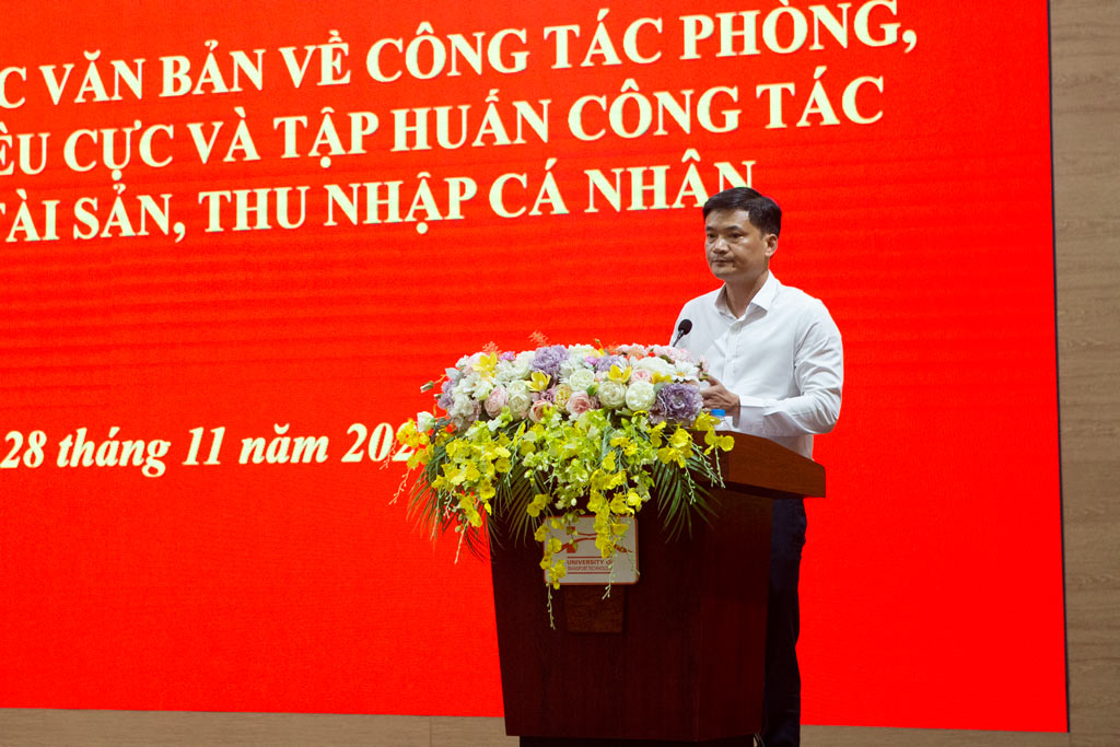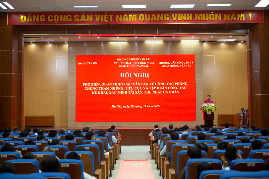 Ngày 28/11, Trường Đại học Công nghệ GTVT phối hợp với Thanh tra Bộ GTVT và Trường Cán bộ quản lý GTVT tổ chức triển khai Hội nghị “Phổ biến các văn bản về công tác phòng, chống tham nhũng, tiêu cực, kê khai, xác minh tài sản, thu nhập cá nhân”. Hội nghị được tổ chức theo hình thức trực tiếp kết hợp trực tuyến tại 3 điểm cầu Hà Nội, Vĩnh Phúc và Thái Nguyên.