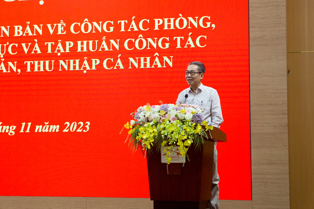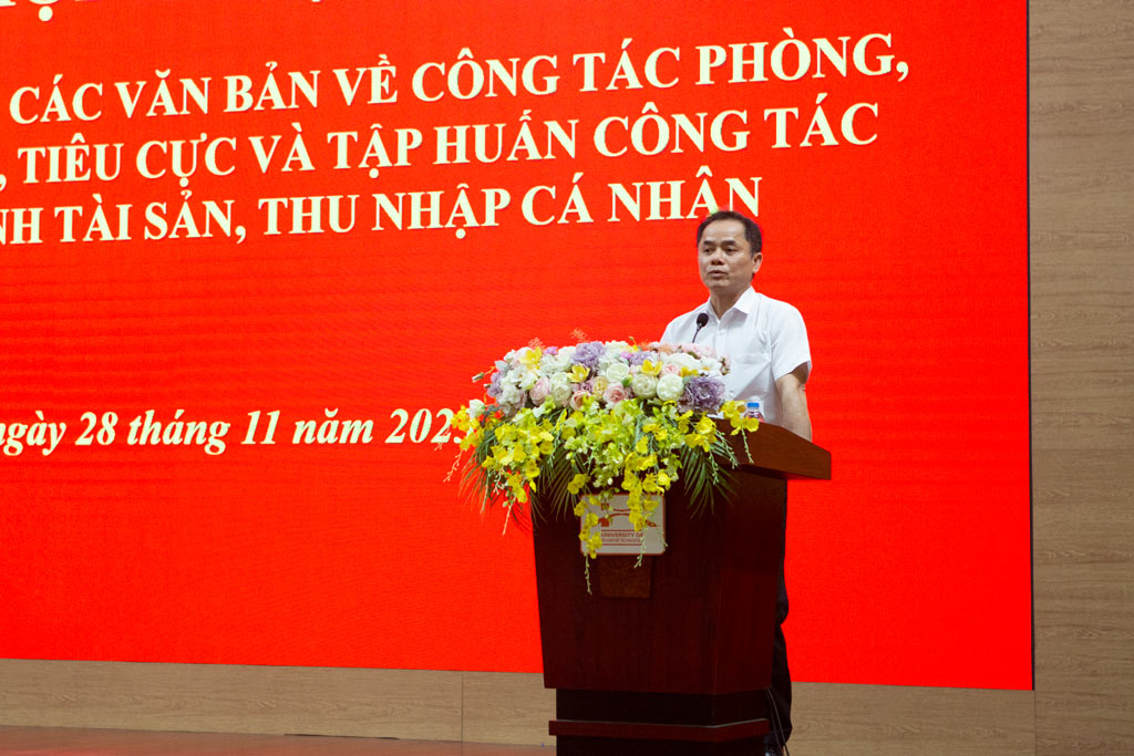 PGS. TS. Vũ Ngọc Khiêm đề nghị các đồng chí cán bộ chủ động xây dựng kế hoạch tổ chức học tập, quán triệt trong đảng bộ bộ phận, chi bộ và đơn vị của mình để thống nhất, tập trung lãnh đạo, thực hiện nghiêm túc, có hiệu quả công tác phòng, chống tham nhũng, tiêu cực, lãng phí trong đơn vị của mình và trong toàn trường, góp phần hoàn thành thắng lợi các nhiệm vụ chính trị của Nhà trường trong năm 2023, 2024 và những năm tiếp theo.