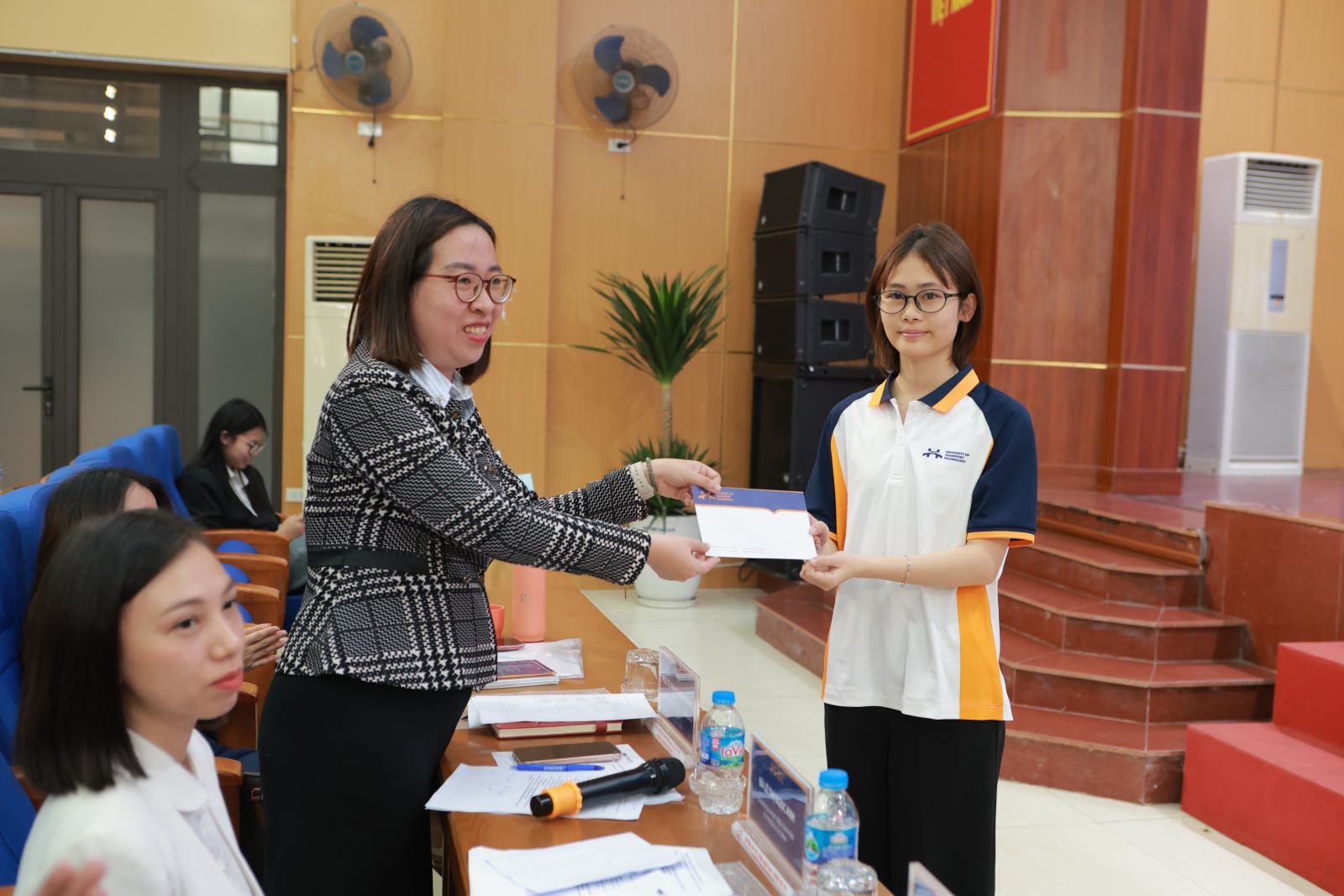 PGS.TS. Phan Thùy Dương - Trưởng ban thư ký, Tạp chí khoa học và Công nghệ giao thông trao quà thưởng cho bạn sinh viên có câu hỏi hay nhất và ấn tượng nhất