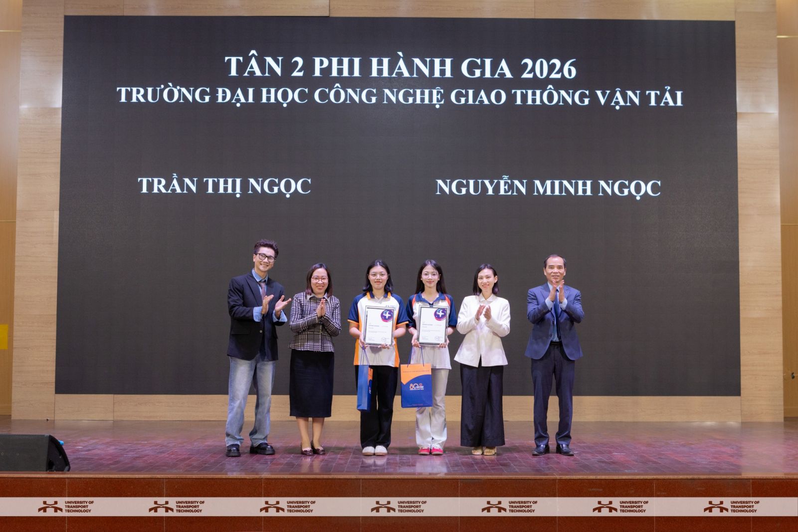 Đại diện lãnh đạo Nhà trường cùng Ban giám khảo trao quà và giấy chứng nhận cho Top 2 “phi hành gia” đại diện UTT tham dự vòng casting cấp quốc gia